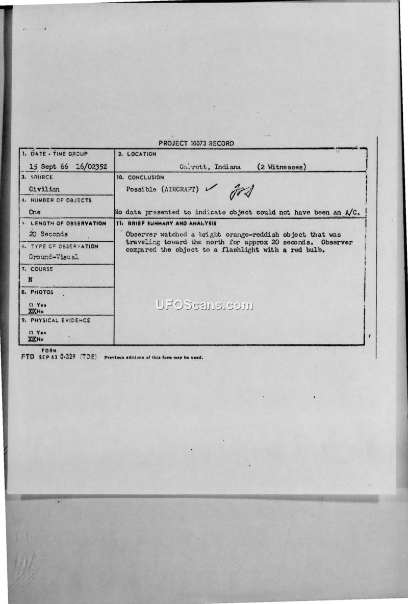 A 1966 sighting in Garrett, Indiana, involving two witnesses who observed a bright orange-reddish light. The U.S. Air Force concluded it was a possible aircraft.
