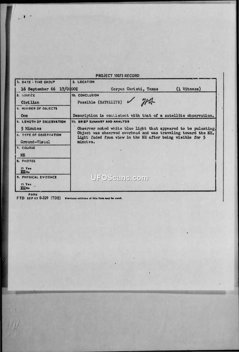 A 14-year-old witness in Corpus Christi, Texas, reported a pulsating white-blue light on 16 September 1966. The Air Force investigation concluded the object was likely a satellite.