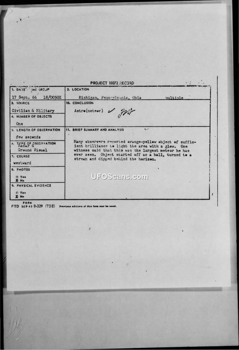 Project 10073 Record: Sighting of 17 September 1966