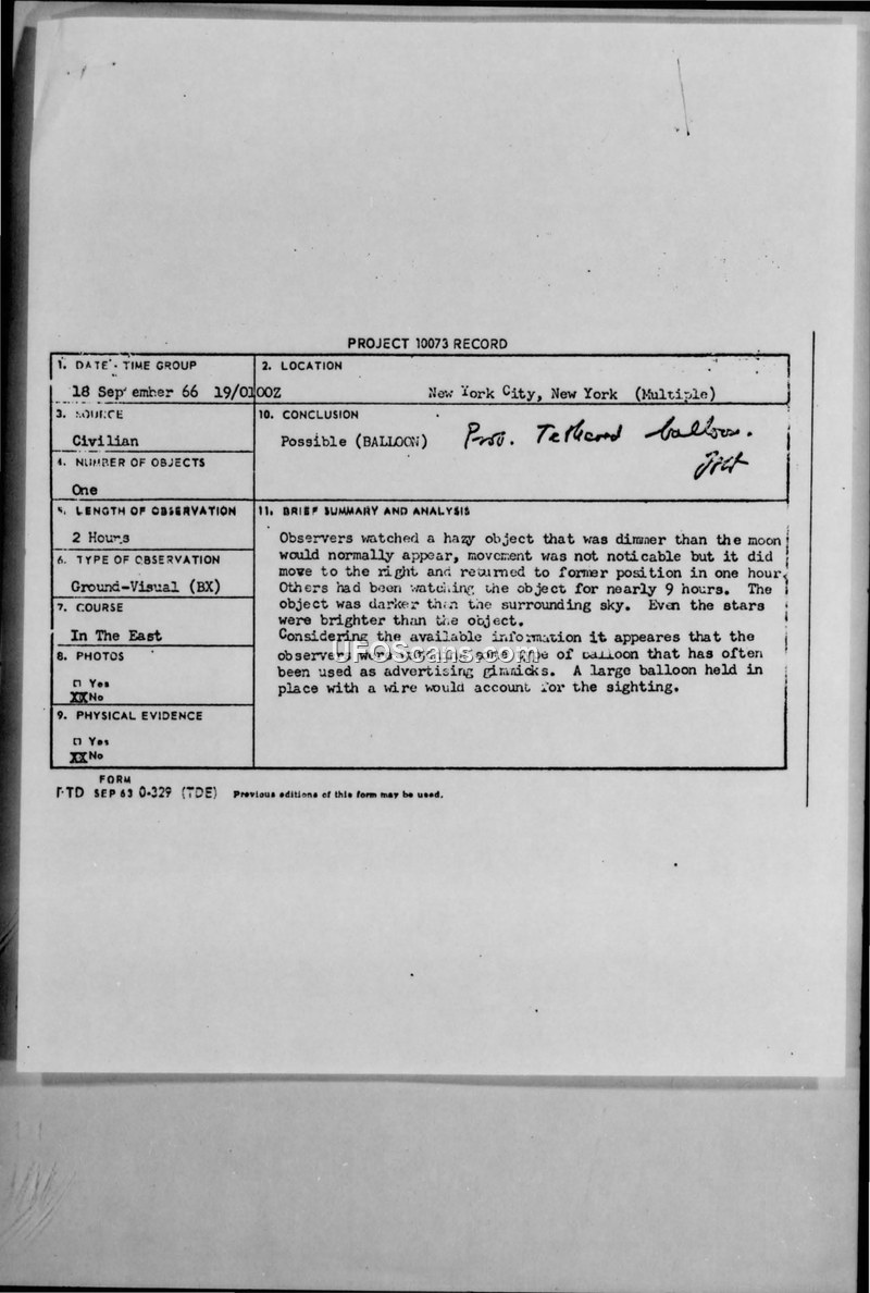 Project 10073 Record — Sighting of 18 September 1966, New York City