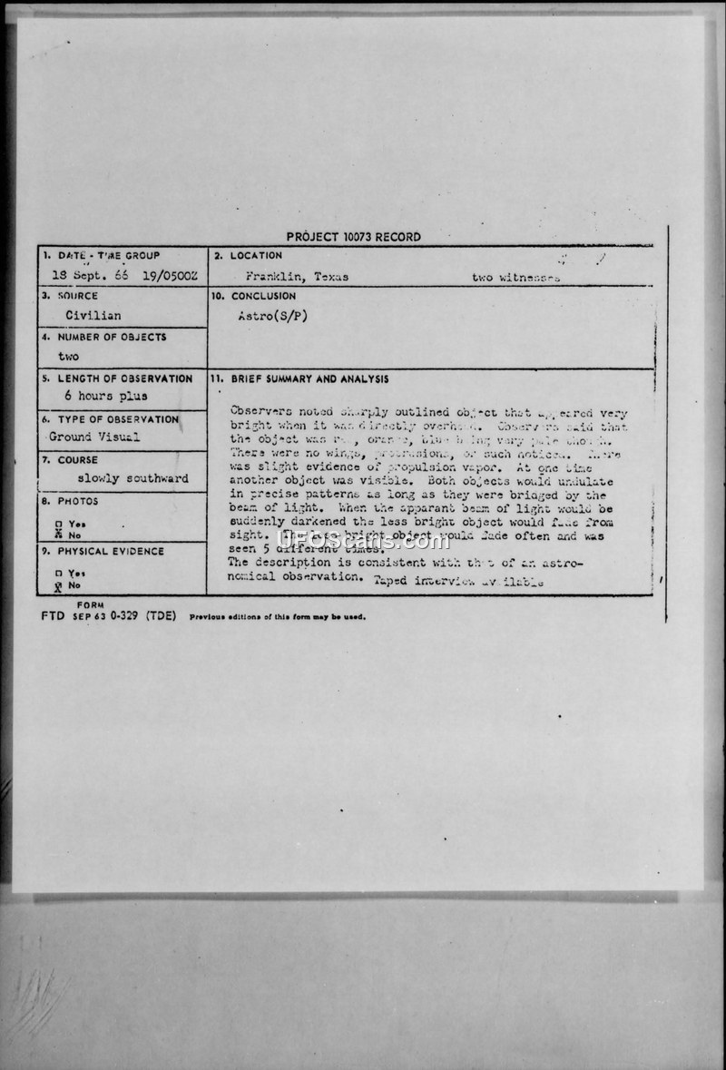 Project 10073 Record: Sighting near Franklin, Texas, 18 September 1966