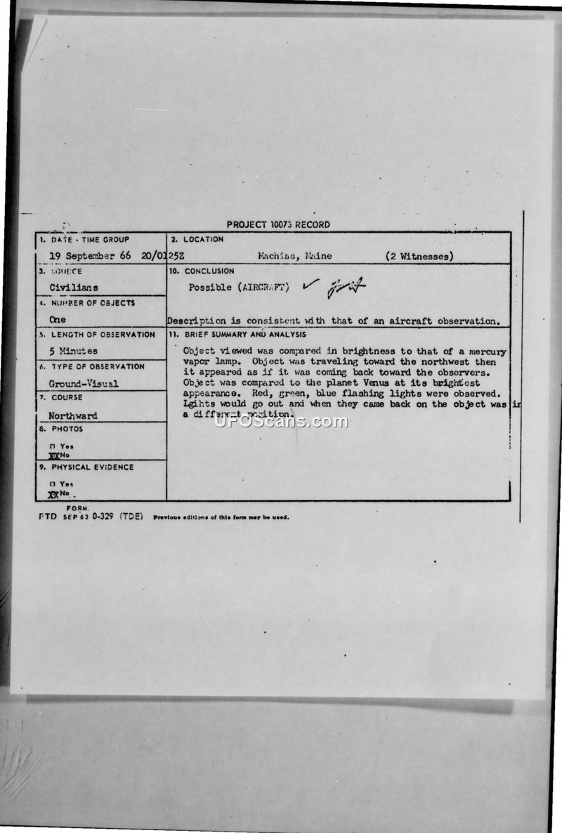 A 1966 sighting in Machias, Maine, was investigated by Project Blue Book. The object, described as having flashing lights, was officially concluded to be consistent with an aircraft.