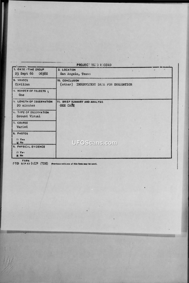 Project Blue Book Sighting Report — San Angelo, Texas, 23 September 1966