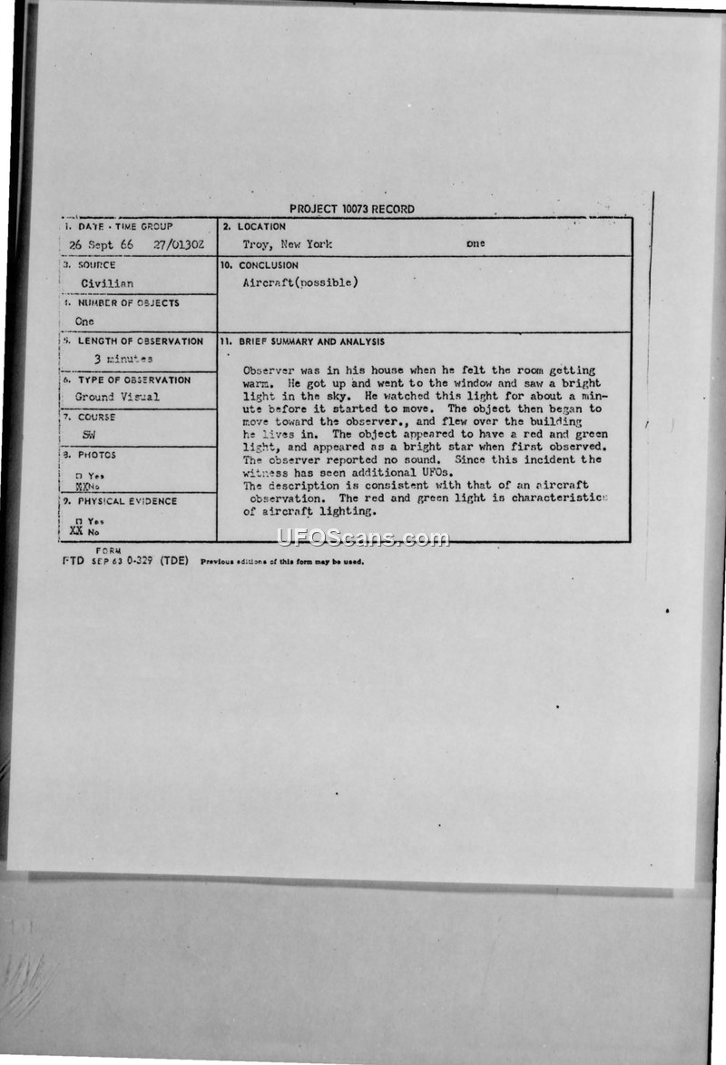 Project 10073 Record — Sighting Report, Troy, New York, 26 September 1966
