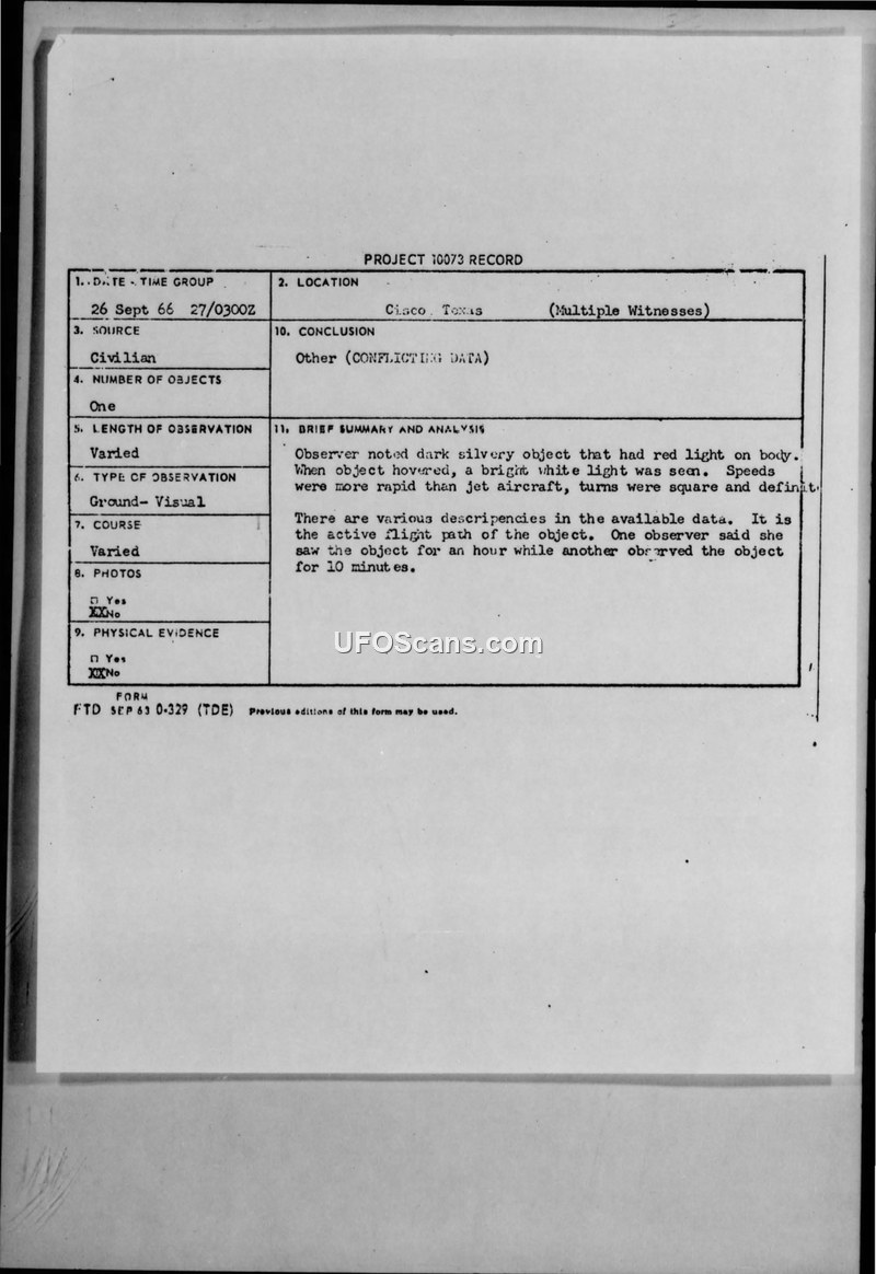 Project 10073 Record — Sighting in Cisco, Texas, September 26, 1966