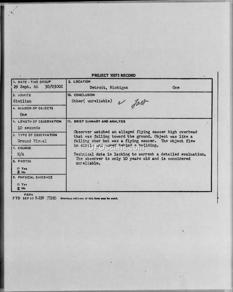 A 1966 UFO sighting report from Detroit, Michigan, involving a 10-year-old witness. The Air Force dismissed the report due to the witness's age and lack of technical data.