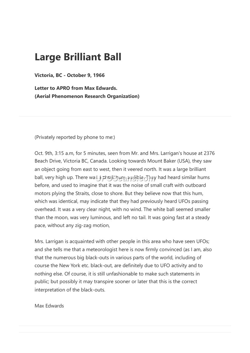 This document is a letter written by Max Edwards to the Aerial Phenomenon Research Organization (APRO) regarding a UFO sighting reported to him by phone. On October 9, 1966, at 3:15 a.m., Mr. and Mrs. Larrigan observed an object from their home at 2376 Beach Drive in Victoria, British Columbia. The witnesses, looking toward Mount Baker in the United States, described a large, brilliant, white ball that was very high in the sky. The object traveled from east to west before veering north. It moved at a fast, steady pace without any zig-zagging motion and left no tail. The witnesses noted that the object was smaller than the moon and emitted a small, audible hum, which they compared to the sound of small craft with outboard motors. The sighting lasted for five minutes on a clear, windless night. In the letter, Edwards mentions that Mrs. Larrigan knows others in the area who have seen UFOs. Furthermore, Edwards asserts that he and a local meteorologist are convinced that major global black-outs, such as the one in New York, are directly caused by UFO activity, despite the public unpopularity of such a theory.