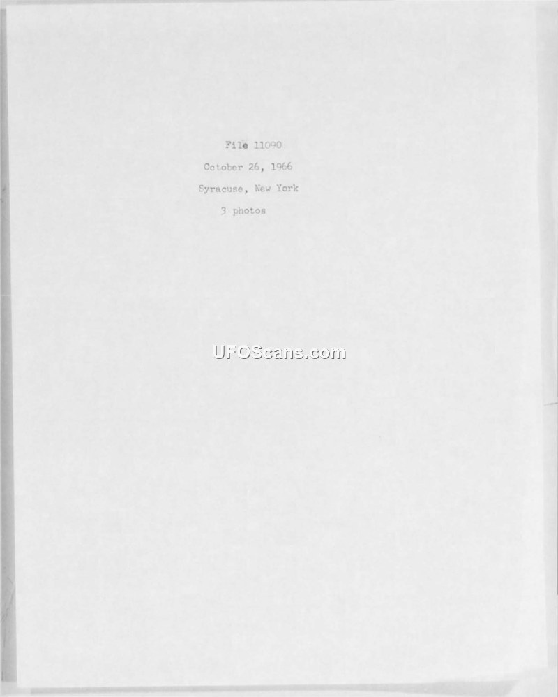 This document, identified as File 11090, serves as a record for a sighting incident that occurred in Syracuse, New York, on October 26, 1966. The file consists of a cover page and three pages containing photographic evidence. The documentation is associated with the Foreign Technology Division of the Air Force Systems Command (AFSC). The photographs depict a bright, circular light source against a dark background. No further descriptive text, witness testimony, or official analysis is provided within the document.