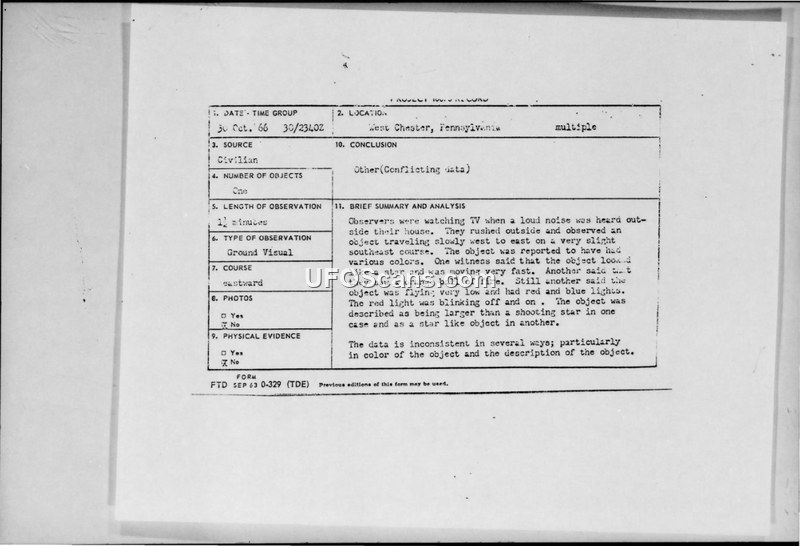 Project Blue Book Sighting Report — West Chester, Pennsylvania, October 30, 1966