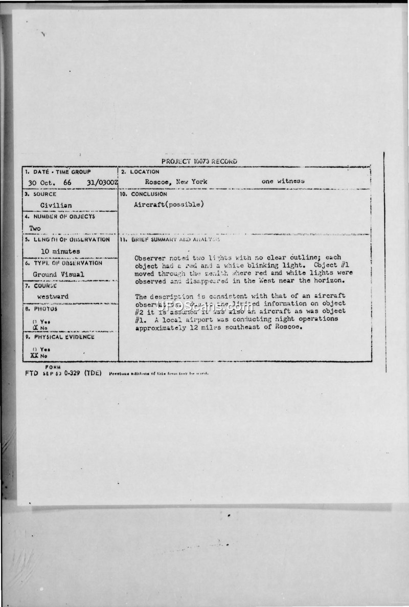 Project 10073 Record — Roscoe, New York, 30 October 1966