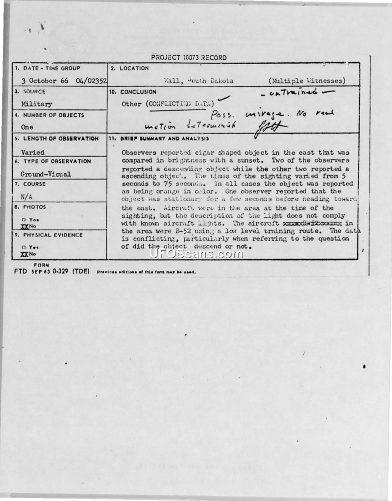 Project 10073 Record: Sighting Report - Wall, South Dakota, 3 October 1966