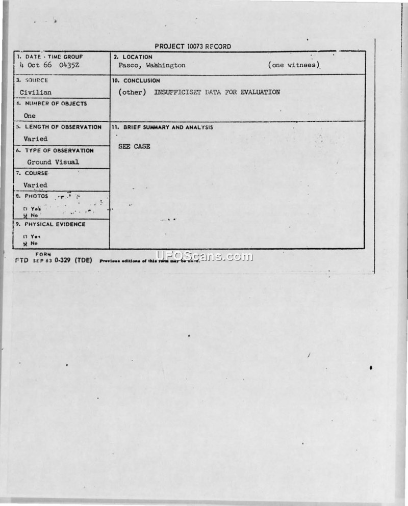 Project 10073 Record: Sighting in Pasco, Washington, 4 October 1966