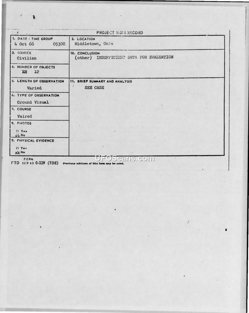 Project 10073 Record — Sighting Report, Middletown, Ohio, 4 October 1966
