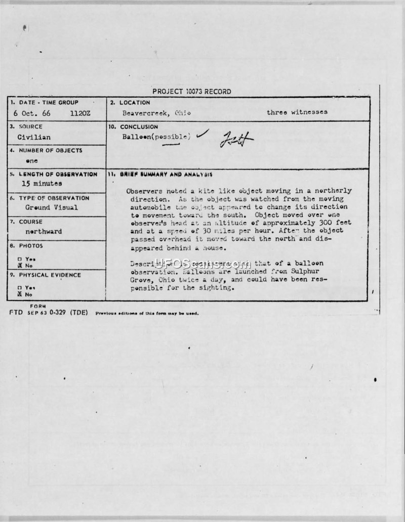 Project 10073 Record — Beavercreek, Ohio, 6 October 1966