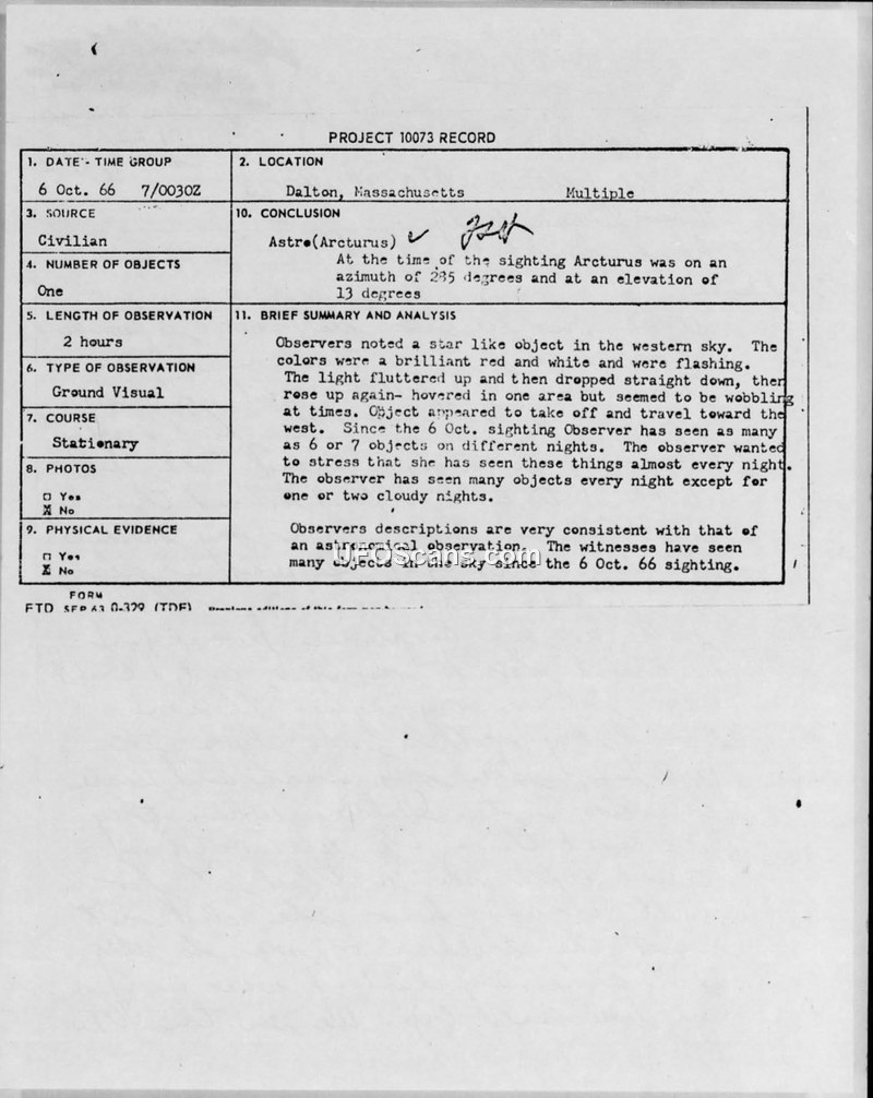 A civilian in Dalton, Massachusetts, reported repeated UAP sightings in October and November 1966. Project Blue Book officially concluded the initial October 6 sighting was the star Arcturus, a finding the witness disputed.