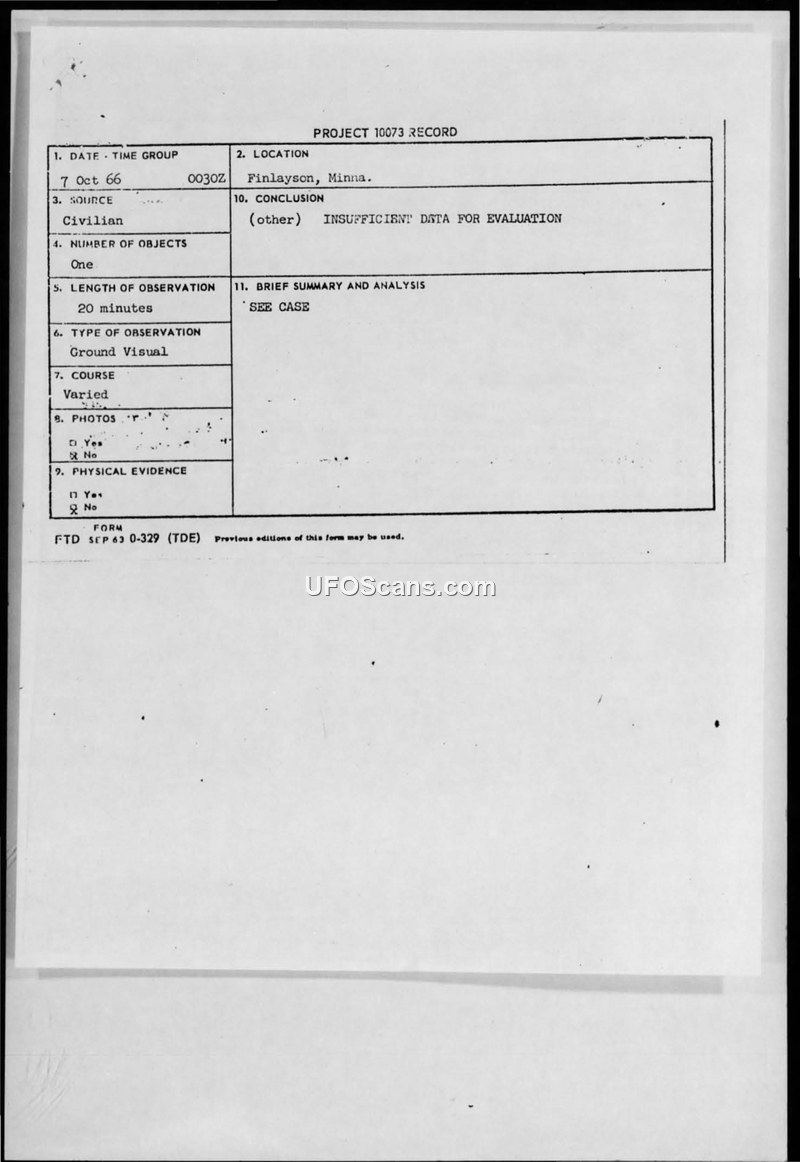 A civilian in Finlayson, Minnesota, reported a 20-minute sighting of a pulsating, oval-shaped object on 7 October 1966. The Air Force concluded there was insufficient data for evaluation.