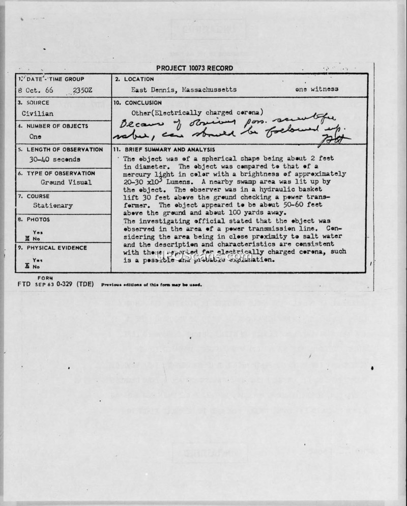 A power company lineman reported a stationary, spherical, glowing object near power lines in East Dennis, Massachusetts, on October 8, 1966. The Air Force concluded the sighting was likely an electrically charged corona.