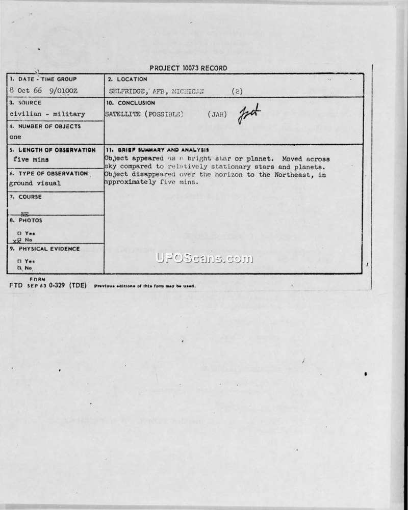 On October 8, 1966, at 0100Z, a sighting of an unidentified aerial object was reported near Selfridge Air Force Base, Michigan. The observation was made by two individuals, one identified as a 31-year-old tool engineer and the other as D. L. Alcott, a USMC navigator. The witnesses observed a single white object that appeared similar to a planet or a star of one or two magnitude. The object was visible for approximately five minutes under clear night conditions with visibility of about 10 miles. The object was initially spotted approximately 10 degrees off the zenith. It traveled in a straight path directly over Selfridge AFB before executing a 45-degree turn toward the northeast and disappearing over the horizon. The report was formally submitted by Captain Mina P. Costin of the 1st Fighter Wing (ADC) to the Foreign Technology Division (FTD) at Wright-Patterson Air Force Base. The official conclusion recorded in the Project 10073 record is that the object was possibly a satellite.
