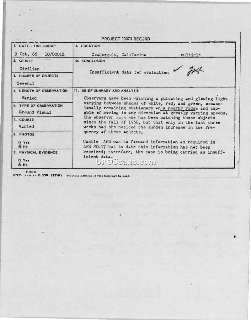 This document consists of a Project 10073 record and an associated Air Force staff message regarding a series of UFO sightings near Coursegold, California. The primary witness, a civilian resident, reported observing pulsating, glowing lights that shifted between white, red, and green. These objects were noted to remain stationary on a nearby ridge and were capable of rapid movement in any direction, often exceeding the speed of observed jet aircraft. One witness reported seeing a rectangular object with bright lights at the corners. The sightings, which reportedly began in the fall of 1960, saw a sudden increase in frequency in the three weeks leading up to the report in October 1966. On October 23, 1966, the witness observed three objects simultaneously, which appeared to move in formation. The witness, described by interviewing officers as calm and intelligent, communicated with other neighbors and a school teacher in Oakhurst, California, regarding these events. Despite the detailed descriptions provided by the witness, the Air Force concluded that there was insufficient data for a formal evaluation, noting that required information from Castle AFB had not been received as per AFR 80-17.