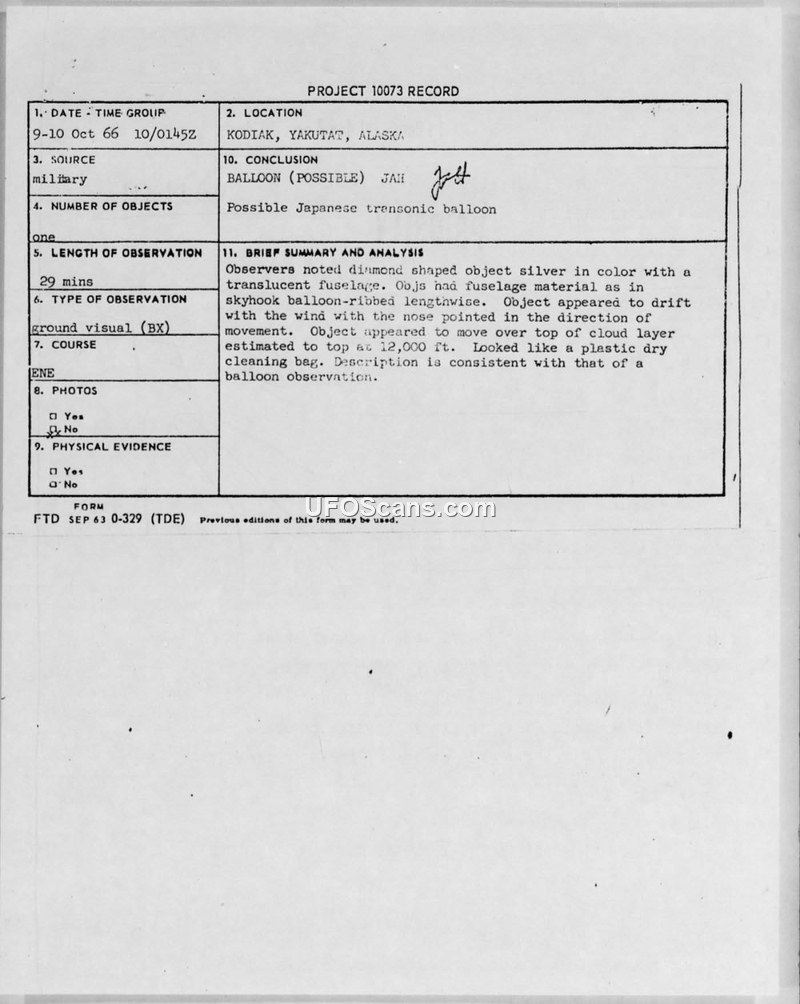 Project 10073 Record: Sighting at Kodiak and Yakutat, Alaska, October 1966