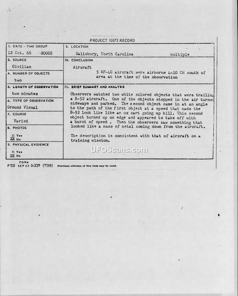 A civilian reported two unidentified objects trailing a B-52 near Salisbury, NC, on October 12, 1966. The Air Force concluded the objects were likely RF-4C aircraft from a nearby training mission.