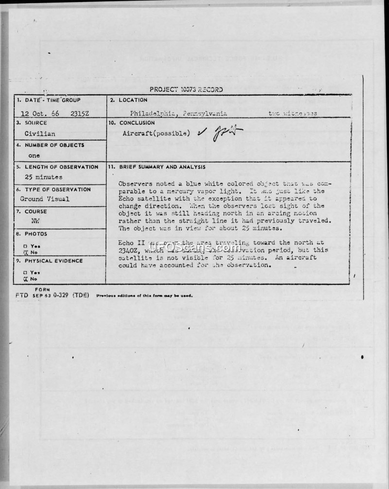 Project 10073 Record — Sighting Report, Philadelphia, Pennsylvania, 12 October 1966
