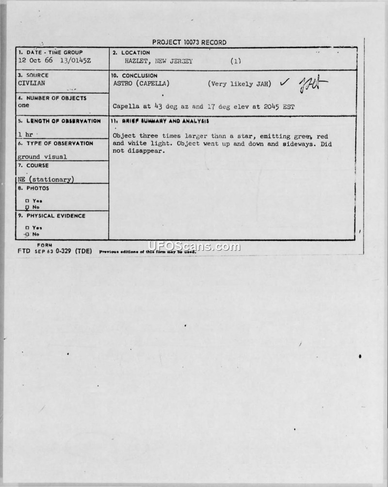 A civilian reported a stationary, multi-colored light in the sky over Hazlet, New Jersey, on October 12, 1966. The Air Force's Foreign Technology Division concluded the object was the star Capella.