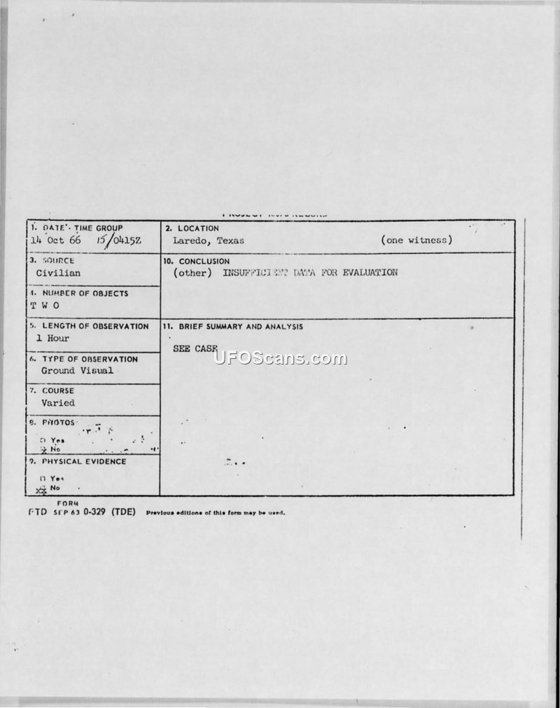 UFO Sightings, 14 October 1966 — Laredo, Texas