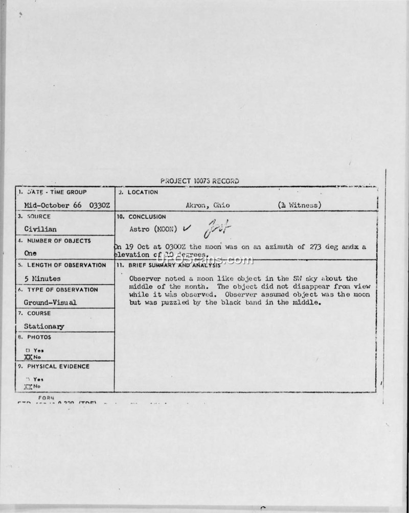 A civilian in Akron, Ohio, reported a moon-like object with a black band in October 1966. The Air Force officially identified the object as the moon but requested further data from the witness to complete their evaluation.
