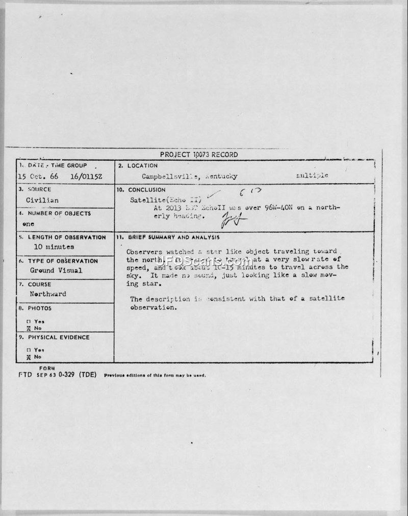 Project 10073 Record — Campbellsville, Kentucky, October 15, 1966