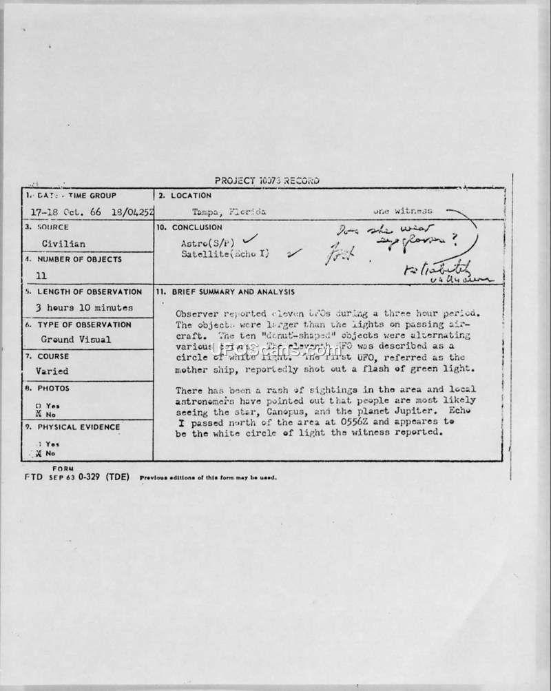 A civilian in Tampa, Florida, reported eleven 'donut-shaped' UFOs over three hours in October 1966. The Air Force concluded the sightings were likely misidentifications of stars, planets, or satellites.