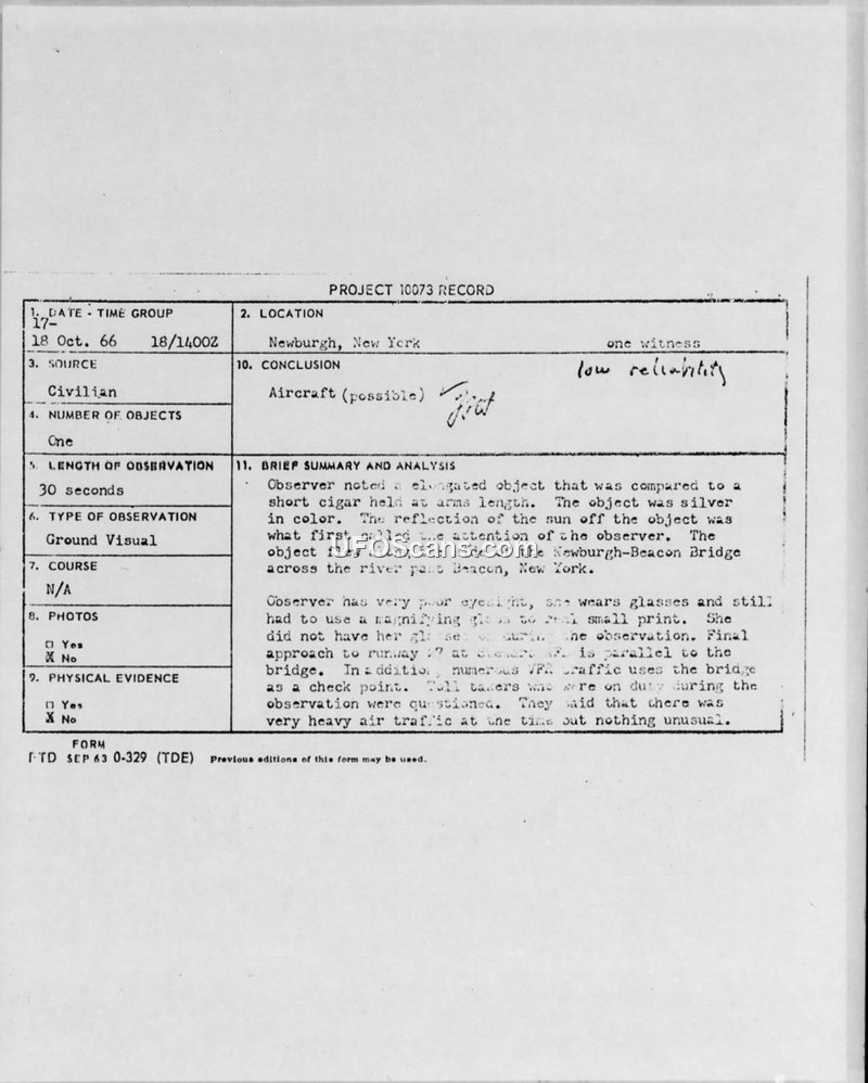 Project 10073 Records: UFO Sightings in Newburgh, New York (October 1966)