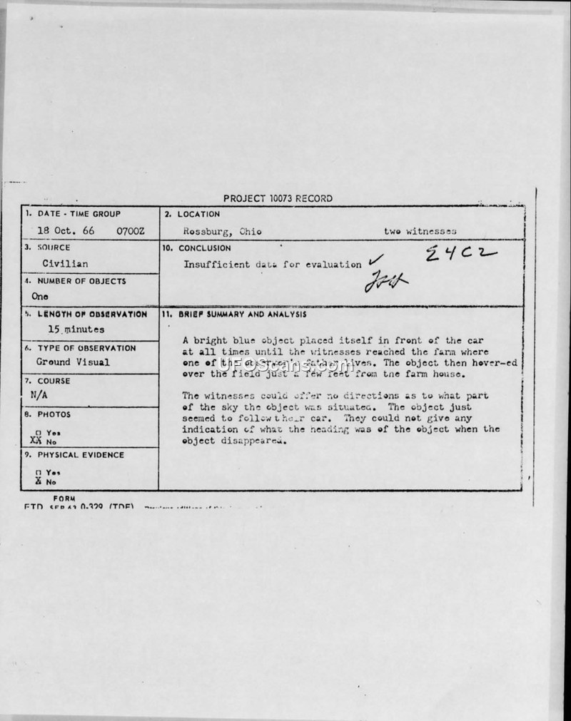 Project 10073 Record — Rossburg, Ohio, 18 October 1966