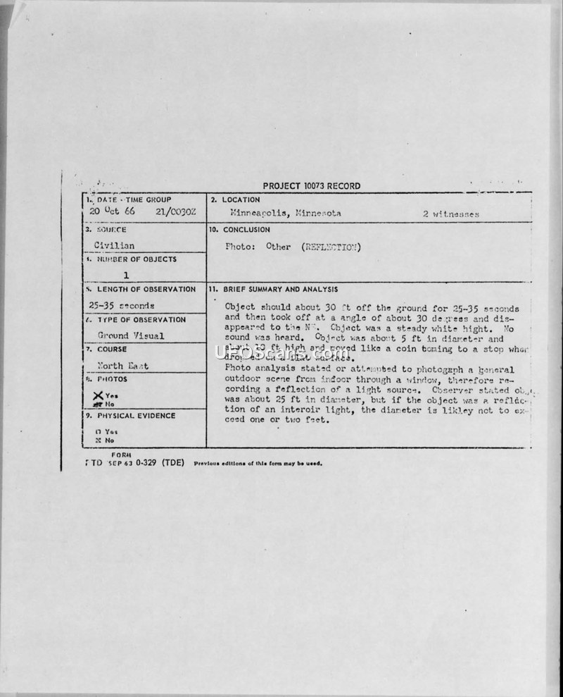 Project 10073 Record: Minneapolis, Minnesota Sightings (1966-1967)