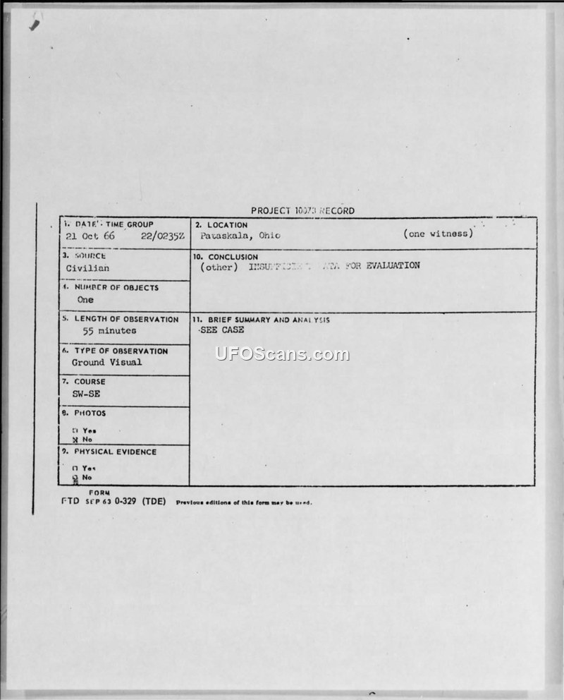 Project 10073 Record — Sighting in Pataskala, Ohio, 21 October 1966