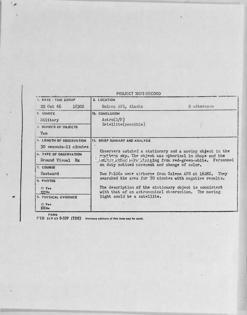 Project 10073 Record — Galena AFS, Alaska, 22 Oct 66
