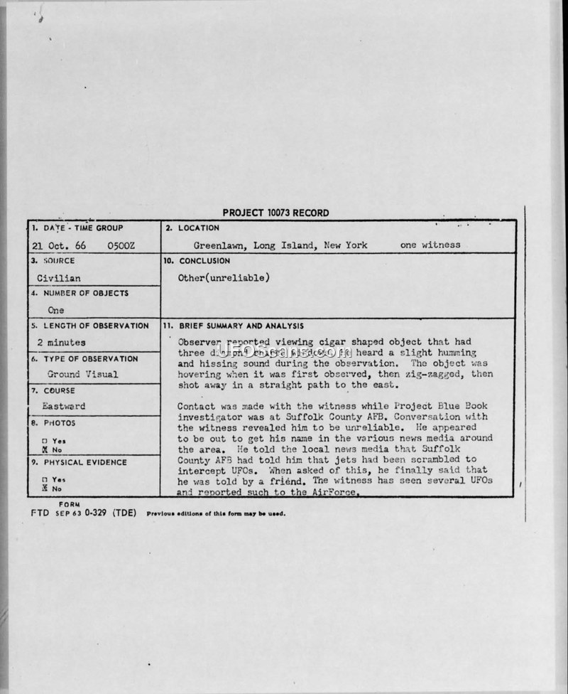 Project 10073 Record — Greenlawn, Long Island, New York, 21 October 1966