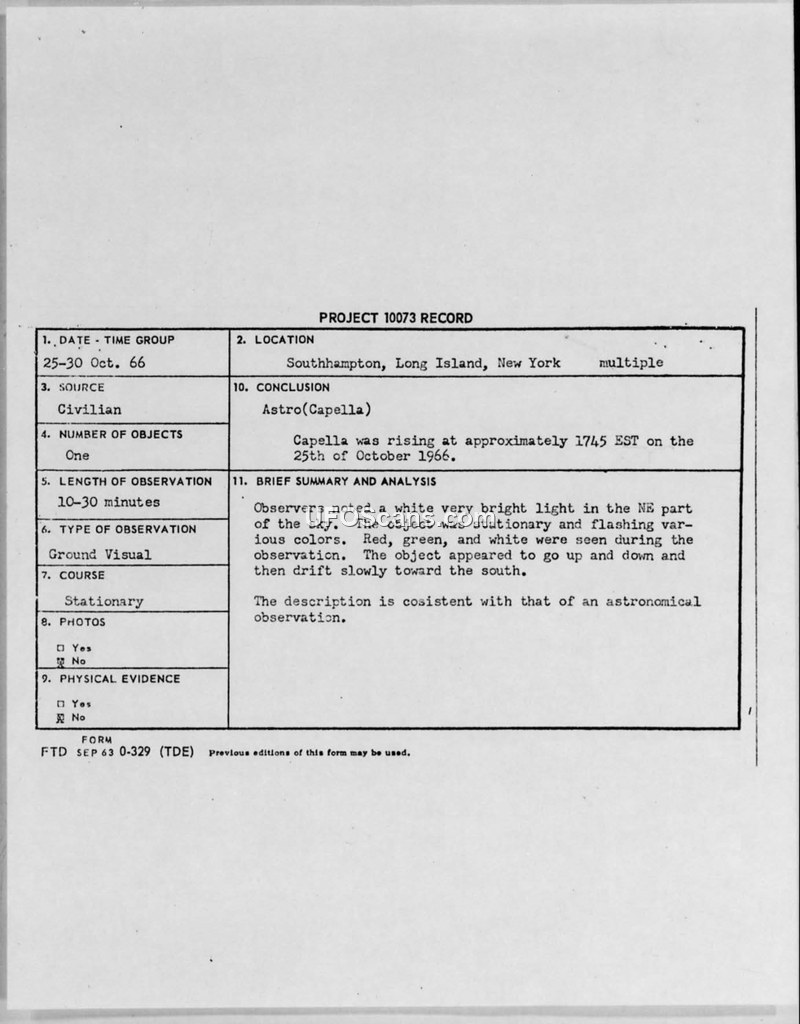 This document is a collection of records from Project 10073, part of the Air Force's Project Blue Book, concerning a series of UFO sightings in Southampton, Long Island, in late October 1966. The reports involve multiple civilian witnesses, including students from Southampton College, who described seeing bright, stationary, or slow-moving lights in the sky that changed colors. One witness submitted photographs as evidence, which were subsequently analyzed by the Air Force. The analysis concluded that the photographs were not of a UFO but were instead trailed images of the moon, and that the claim regarding the date of the photographs was fraudulent. The Air Force conducted extensive inquiries with local military and government agencies, including the Suffolk County AFB, the Coast Guard, and the 104th Tactical Fighter Group, to rule out the possibility of military aircraft or helicopter activity in the area during the time of the sightings. The investigation consistently found no evidence of military involvement, and the majority of the sightings were attributed to astronomical phenomena, specifically the stars Capella and Rigel, or were deemed to have insufficient data for a comprehensive evaluation.