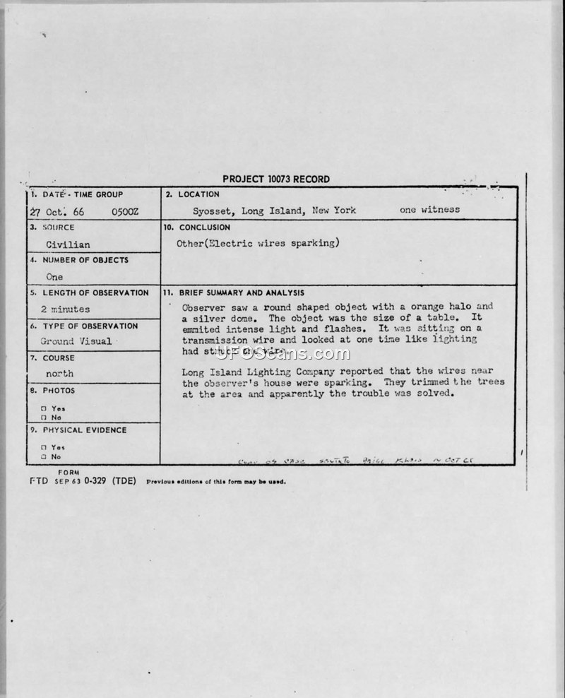 PROJECT 10073 RECORD — Syosset, Long Island, New York, 27 Oct 66