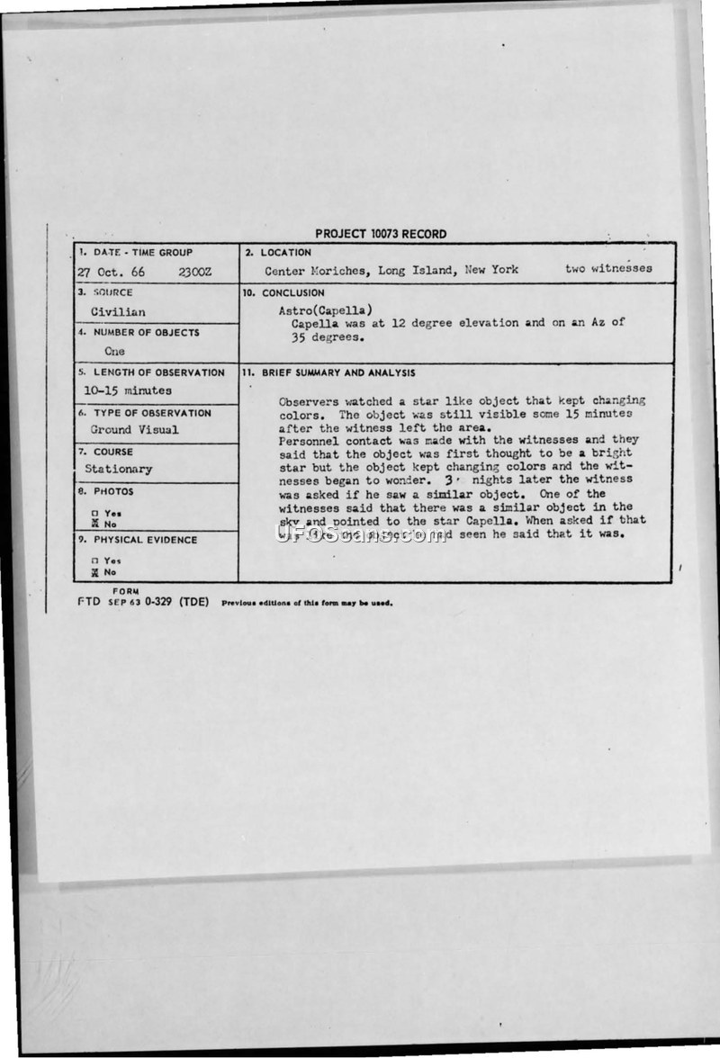 PROJECT 10073 RECORD — Center Moriches, Long Island, New York, 27 Oct 66