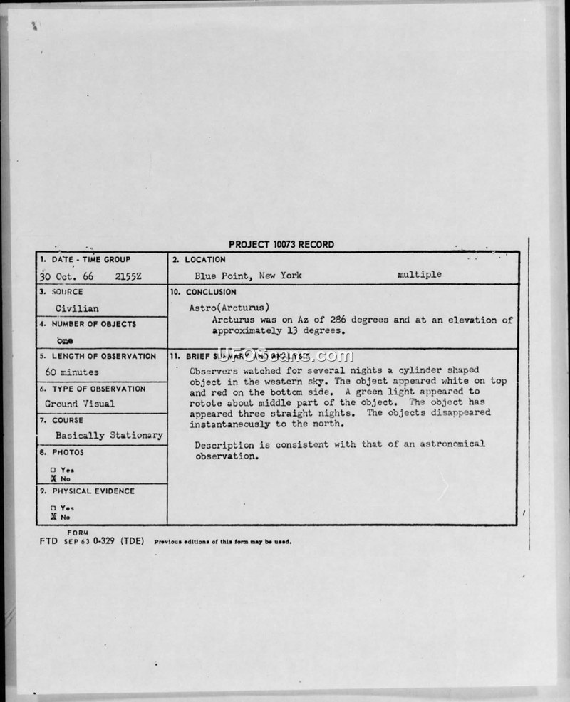 A civilian reported a cylinder-shaped object in Blue Point, New York, on October 30, 1966. The Air Force investigation concluded the sighting was an astronomical observation of the star Arcturus.