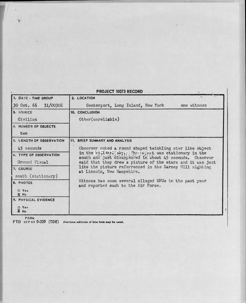 PROJECT 10073 RECORD - Centerport, Long Island, New York - 30 Oct 66