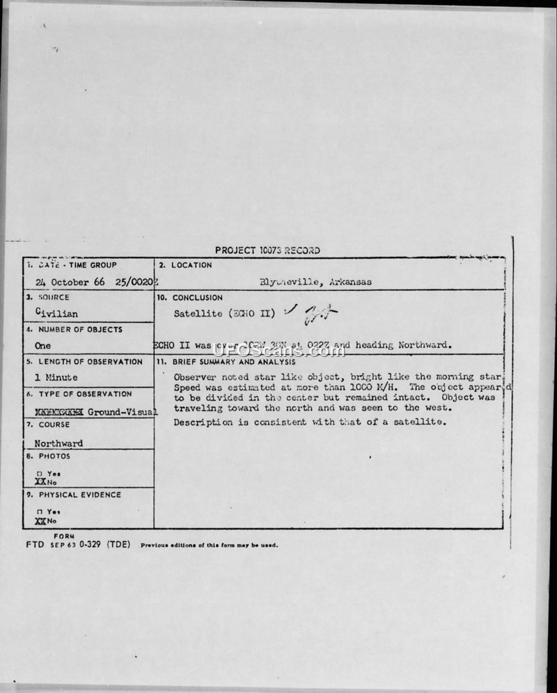 A civilian in Blytheville, Arkansas, reported a high-speed, star-like object on October 24, 1966. The Air Force concluded the object was the ECHO II satellite.
