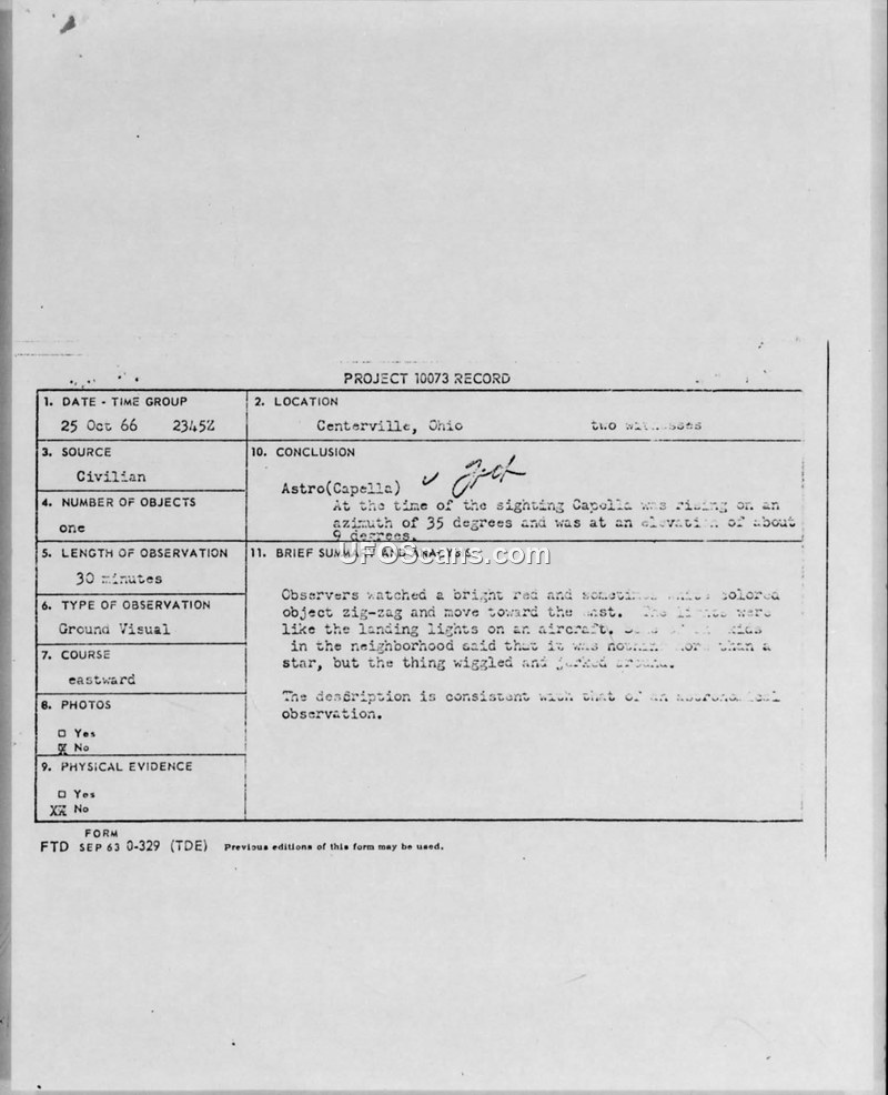 A civilian reported a 30-minute sighting of a disk-shaped object in Centerville, Ohio, on October 25, 1966. The Air Force officially concluded the object was the star Capella.
