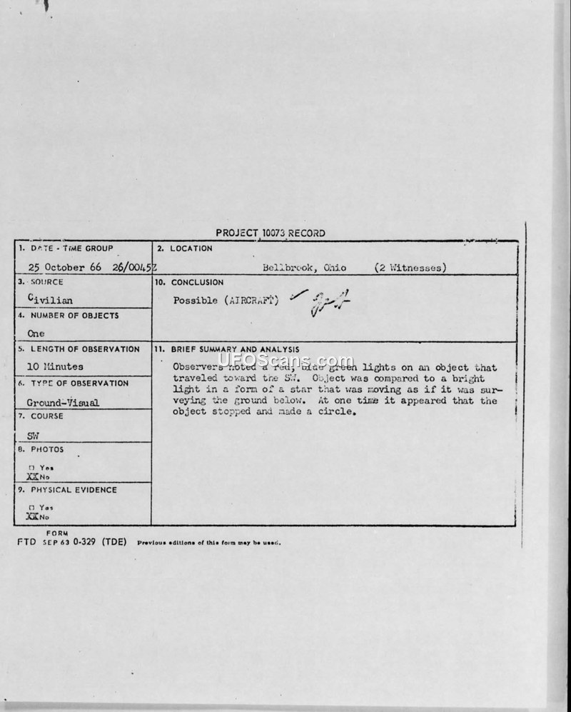 Project 10073 Record — Bellbrook, Ohio, 25 October 1966