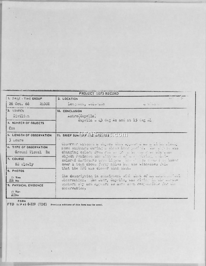 A civilian in Longmont, Colorado, reported a three-hour sighting of a multi-colored, stationary light in October 1966. The Air Force investigation concluded the object was the star Capella.
