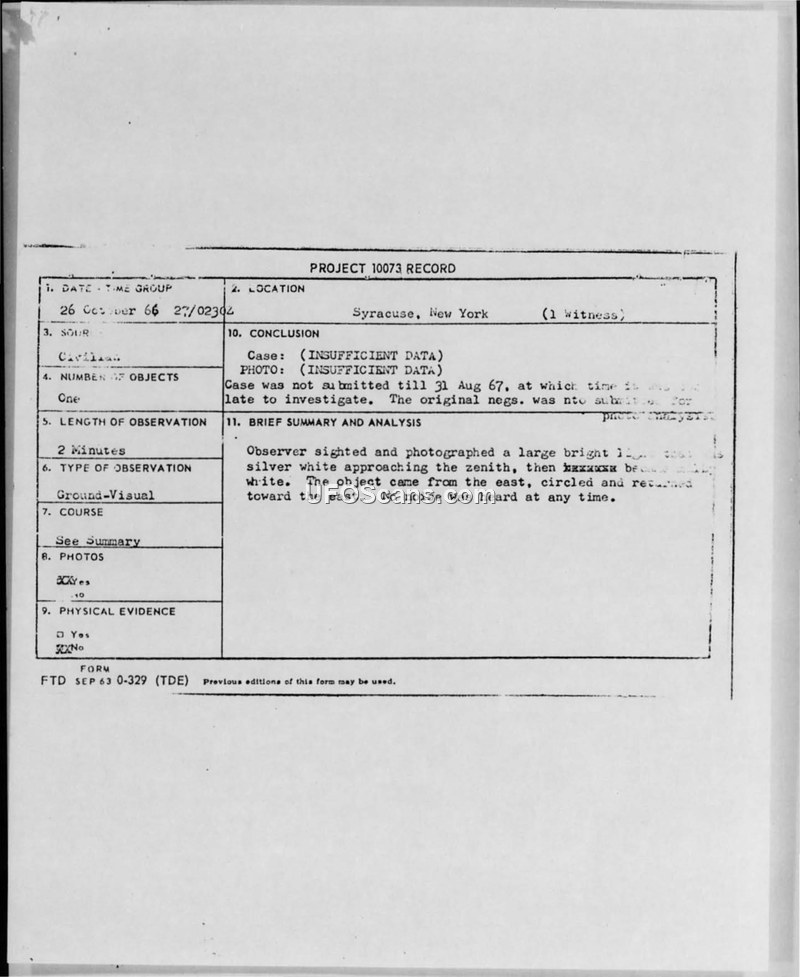 Project 10073 Record: Sighting Report — Syracuse, New York, 26 October 1966