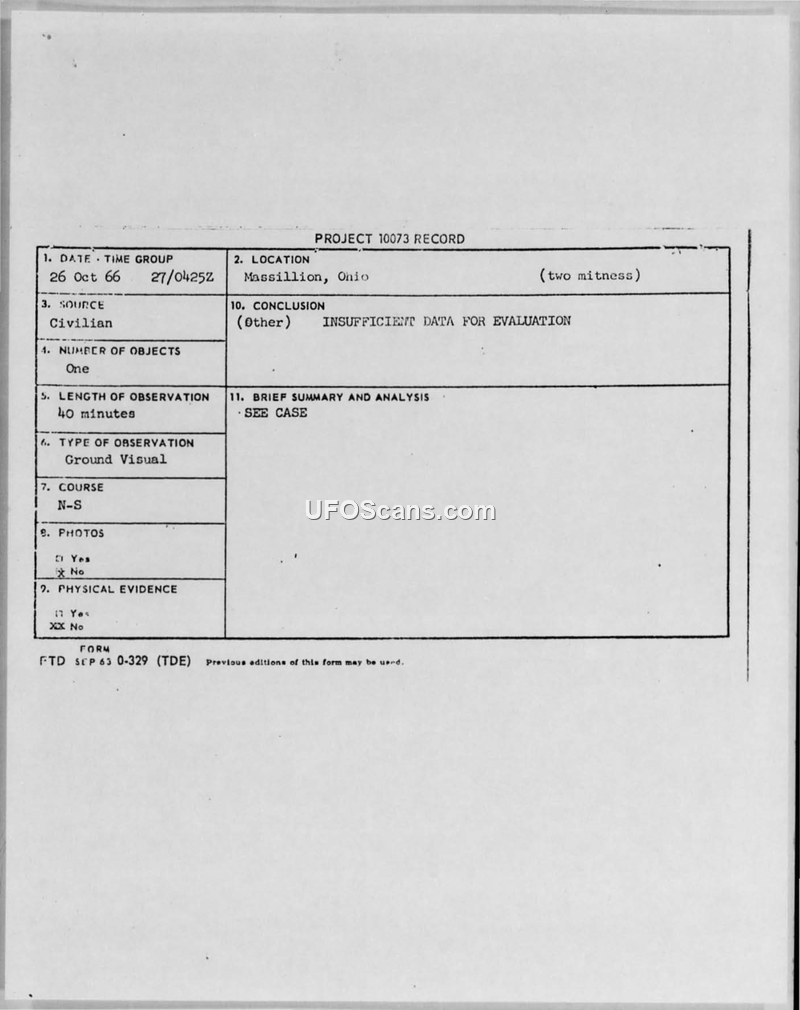 A civilian in Massillon, Ohio, reported a 40-minute sighting of a flashing red and green object on October 26, 1966. The Air Force concluded the data was insufficient for evaluation.