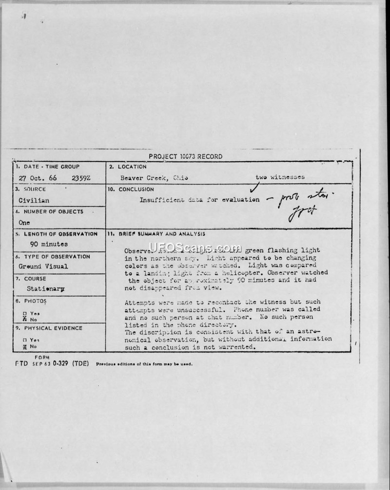 Project 10073 Record — Beaver Creek, Ohio, 27 October 1966