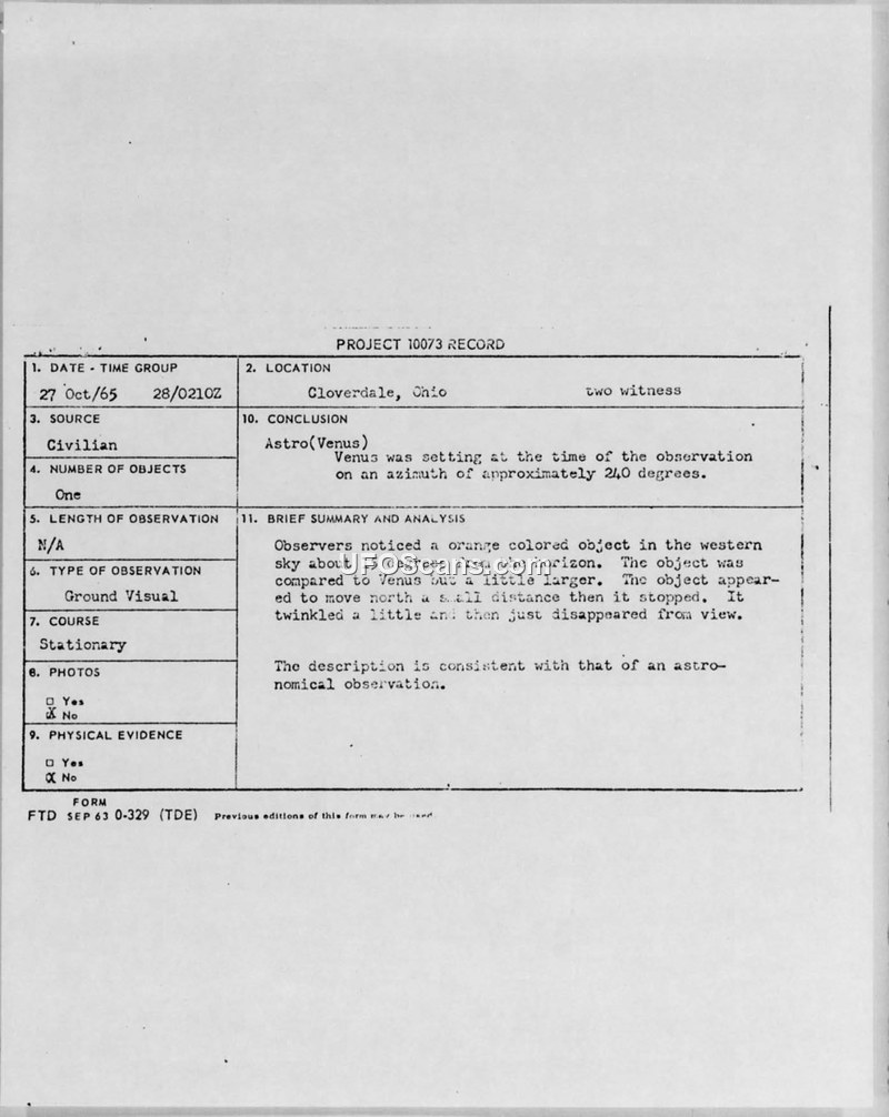 Project 10073 Record: UFO Sighting, Cloverdale, Ohio